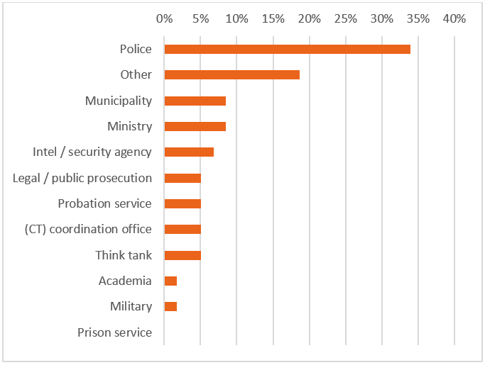 Respondents were asked what type of organisation they currently work for. Figure 1 shows that, at 34% (n=20), most represent police organisations with the broad category of ‘other’ in second place at 19% (n=11). Those who specified this category indicated a broad range of employers, including aviation security, international organisations, and non-profits.[iii] Local and national-level governments are also quite well represented, followed by intelligence and security agencies, and an equal distribution among legal professions, probation and parole services, inter or intra-government (CT) coordinating bodies, and think-tanks. None of the 59 respondents prison services. Likely, this is simply due to the relatively small sample size. The small number (n=1) of military professionals, however, might also reflect the preference of most Western European states to pursue a rule-of-law based approach to counterterrorism.