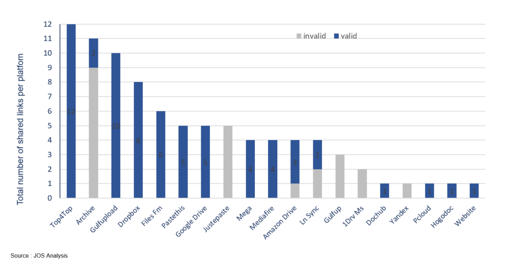 Some 95% of the links found already returned errors only a few hours after al-Naba’s release. Nevertheless, additional links emerged a few days later in Telegram channels, particularly after some of the initial links were deleted. Of these new links, 65 out of 88 links (74%) were still active 10 days after al-Naba’s release, more than 3 days after the publication of the next issue. Figure 1 provides an overview of the ratio between valid and invalid links across the platforms surveyed after a 10-day period.